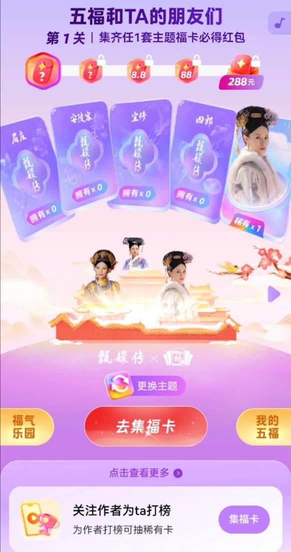 福卡中“稀有卡”概念,与传统五福中的“敬业福”相似,因其经常成为网友难集的卡,所以其“稀有”的特性就被保留下来。在这次集福的每个IP主题5张卡中,都有1张卡成为“稀有卡”,比如《甄嬛传》主题的稀有卡是“甄嬛”。